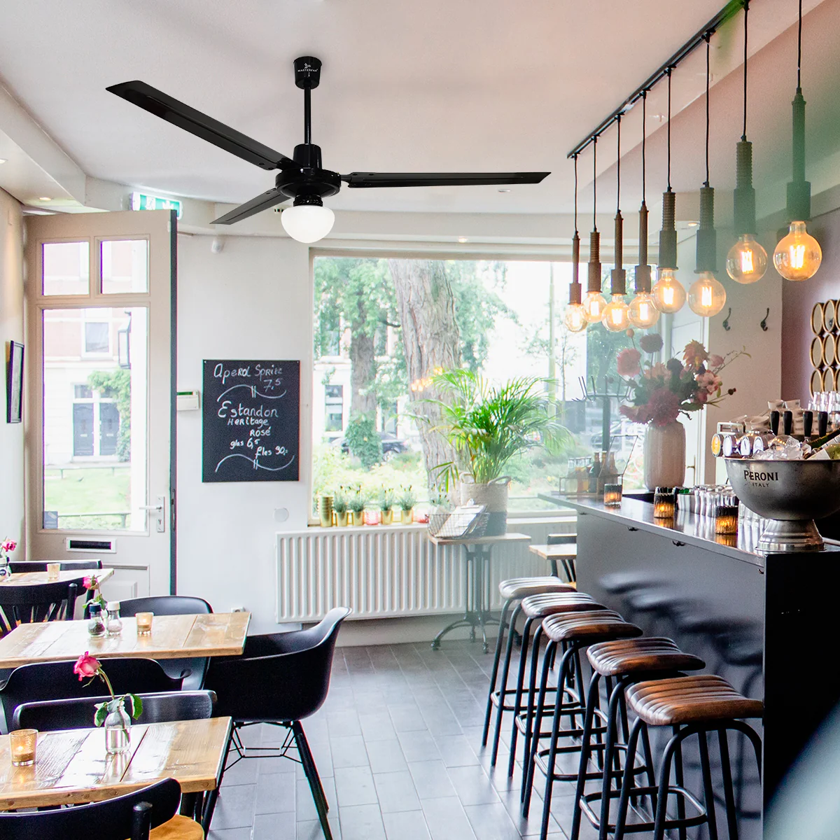 Poderoso ventilador industrial de techo Icarus de Masterfan, mantiene una constante circulación del aire en áreas de hasta 144 m2 gracias al diseño de sus aspas e inclinación de 6° al ser montadas al motor.
